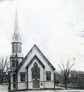 The First Baptist Church was formed on March 1, 1815 with thirteen members and services were held in the Daniel Frye house and in an old meeting house which was enlarged twice. In 1840 they built a church on this site which burned in 1869. The present church was built in 1869 and dedicated in January 1870. The architect was Rufus Sargent of Newburyport.[3] The bell, which was cast in Baltimore and weighed 1600 lb was installed in 1878.[4] The steeple was removed in 1913.[5]