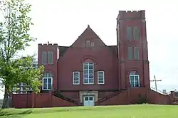 The First Baptist Church is a historic church building in Muskogee, Oklahoma. The church was built in 1903 and was the first church building for the African-American population of Muskogee County. It was built in a Romanesque Revival style. It features two asymmetrical, crenelated towers and a steeply pitched gabled roof. The build is clad in two types of red brick. The two types of brick are separated by a rusticated limestone belt course. The building was listed on the National Register of Historic Places in 1984 for architectural significance and for its importance in local African-American history.