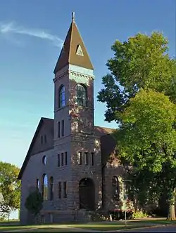 Rock Rapids United Methodist Church, formerly known as First Methodist Church, is located in Rock Rapids, Iowa, United States. The church building is significant for the use of blue-gray and red granite used in its construction.[2] It was designed by Sioux Falls, South Dakota architect Joseph Schwartz utilizing the Richardsonian Romanesque style. Completed in 1896, it is the second church building for a congregation founded in the 1870s. The blue-gray granite quarried near Sioux Falls is the main building material, and it is laid in a random ashlar pattern. The red granite was acquired from the receiver of a bankrupt packing plant which had begun, but did not complete, a new stone building. It is used for the trim, especially in the voussoirs of alternating colors. The building also features a tall corner bell tower. The pipe organ was ordered from the Hinners Organ Company of Pekin, Illinois in January 1905 at a cost of $1,960 (equivalent to $59,000 in 2021).[3][4] An addition was added to the south side of the church in 1966. The church was added to the National Register of Historic Places in 1978.[1]