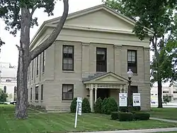 The Greek Revival structure was built of locally quarried limestone. The building retains its original wood gable, but it has been covered with asphalt for economic reasons. The bell tower was removed when it was converted into a school. Doric pediments adorn the north and south ends of the building. The interior features eight wooden columns.[2]
