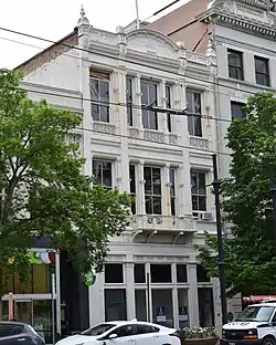 Construction began on the First National Bank building in 1872 after demolition of the Commerce Building on East Temple Street.[3] East Temple Street was renamed Main Street in 1906.[4] The building featured a cast iron facade that was assembled as quickly as it arrived. Bank president Warren Hussey became the sole owner of the building and the bank in December, 1872.[5] The building opened in September, 1873.[6]