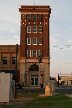 The First National Bank of Morrilton is a historic commercial building at Broadway and Moose Streets in Morrilton, Arkansas. It is a narrow five-story masonry building, occupying a prominent location at the city's main downtown intersection. It was built in 1925 to a design by architect Charles L. Thompson, and has Classical Revival and Bungalow/Craftsman features. The short Broadway Street facade features a recessed entrance with Classical features, while the upper floors are relatively unadorned red brick, with Craftsman motifs in tile around the top floor windows.[2]