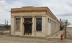 The First National Bank of Rock River was built in 1919 in the small community of Rock River, Wyoming, at the peak of a local oil boom and operated from February 1920. The bank closed its doors on April 11, 1923 (The Wyoming State Journal (Lander), Volume 40, Number 16, April 20, 1923) as the oil boom collapsed and its vice president was convicted of embezzlement. The bank went into receivership on June 14, 1923 and its building sold to the new Citizen's State Bank, but was claimed by Albany County for back taxes in 1931. In 1936 the county sold the building to the town. It became a civic center for the town, operating a post office until the 1950s. A doctor's office had occupied the rear in the 1920s, and in the 1940s apartments were built, which later became the town's jail. With the departure of the post office the building became a fire station. From 1935 to 1985 the Council Room was used by civic organizations. From 1940 to 1985 another room was the town library.[2]