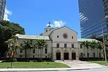 First Presbyterian Church is a historic church in Miami, Florida, USA. It is located at 609 Brickell Avenue in Greater Downtown Miami. Built in 1949, it was placed on the National Register of Historic Places in 1989 (submitted in 1988),[1][2] and designated historic by the City of Miami in 2003. The congregation dates back as far as the city of Miami, 1896,[3] with the original building on another property being funded by Henry Flagler in 1900. The architect of the current building was Lester Geisler.[4] The building represents a late example of the Mediterranean Revival architecture, popular in South Florida earlier in the century. The building sits on a three-acre property surrounded by high-rises. Built for a congregation of over 1,000, church membership dwindled from 1400 to less than 150 by the early aughts.[3]