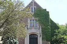 The parish house, also called the social hall, is a two-story Collegiate Gothic-style building erected in 1931 by Charles R. Krieg Inc.[54] It is connected to the southwestern facade of the church and faces southwest toward Seabury Street. The parish house has a gable roof made of slate, a steel-and-concrete frame, and a brick facade above a stone base. The main double door on Seabury Street has a stone surround and an inscription identifying it as the Church House.[69] The facade's decorative details include quoins made of limestone, surrounds around the door and window openings, and casement windows.[54] The southeastern elevation has seven bays, while the northwestern elevation has a door and four bays; these bays are separated by brick buttresses capped with stone. The visible portion of the northeastern elevation is clad with brick.[73]
