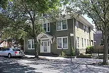 The manse, which dates from 1907, is a nine-room, 2+1⁄2-story L-shaped house along Seabury Street to the southwest, near the corner with 54th Avenue.[71] It serves as the pastor's residence. As originally built, the manse had a main entrance with Ionic-style pilasters and a portico with a pediment. A porch with columns ran around the manse, and there was a keystone above the rounded dormer window on the main facade.[48] The porch was removed sometime between 1923 and 1925.[46] The facade is clad with green wooden siding with several windows on all four sides; the northeast and southwest elevations contain double- and triple-width windows, while the northwest and southeast elevations contain only single-width windows. The northeast elevation contains a small foyer. It is topped by a hip roof, with a brick chimney above the center and a dormer window projecting above the second floor on the southwest and southeast sides.[71]