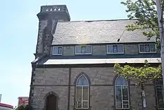 The northwestern elevation contains windows that look into the aisle of the nave, as well as the clerestory windows above them. There are five bays; each of these bays has one pointed arch on the lower section of the facade, which are all surrounded with brownstone, and three windows on the clerestory level. A pointed arch with a recessed wooden door is on the left (northern) side.[64] The southeastern elevation is similar to the northeastern one, except that the right (northern) side has a concrete facade, and the left (southern) side contains sections of brick. The southwestern elevation is made of brick and has one arched window to the left and one door to the right. The southern corner of the church building is attached to the parish hall.[66]
