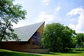 The society is housed in the historic Unitarian Meeting House, which was designed by Frank Lloyd Wright, one of its members and the son of two of its founders.[5] Wright was commissioned to design the Meeting House in 1946.[6] The dramatic result has been variously interpreted as the prow of a ship, a plow cutting through the prairie, and hands folded in prayer.