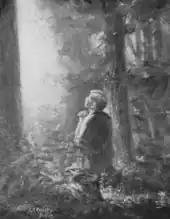 Smith said that when he was about twelve (c. 1817–18), he became interested in religion and distressed about his sins.[7] He studied the Bible and attended church, but the accounts differ as to whether he determined on his own that there was no existing religion built upon the true teachings of Jesus[8] or whether the idea that all churches were false had not "entered his heart" until he experienced the vision.[9] During this period of religious concern, he determined to turn to God in prayer. An early account says the purpose of this prayer was to ask God for mercy for his sins[8] while later accounts emphasize his desire to know which church he should join.[10] Smith said he went one spring morning to a secluded grove near his home to pray.[11] He said he went to a stump in a clearing where he had left his axe the day before[12] and began to offer his first audible prayer.[13]