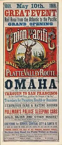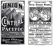 North America's first transcontinental railroad (known originally as the "Pacific Railroad" and later as the "Overland Route") was a 1,911-mile (3,075 km) continuous railroad line constructed between 1863 and 1869 that connected the existing eastern U.S. rail network at Council Bluffs, Iowa, with the Pacific coast at the Oakland Long Wharf on San Francisco Bay.[1] The rail line was built by three private companies over public lands provided by extensive US land grants.[2] Building was financed by both state and US government subsidy bonds as well as by company-issued mortgage bonds.[3][4][5][N 1] The Western Pacific Railroad Company built 132 miles (212 km) of track from the road's western terminus at Alameda/Oakland to Sacramento, California. The Central Pacific Railroad Company of California (CPRR) constructed 690 miles (1,110 km) east from Sacramento to Promontory Summit, Utah Territory. The Union Pacific Railroad (UPRR) built 1,085 miles (1,746 km) from the road's eastern terminus at the Missouri River settlements of Council Bluffs and Omaha, Nebraska, westward to Promontory Summit.[7][8][9]