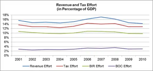 Tax collections comprise the biggest percentage of revenue collected. Its biggest contributor is the Bureau of Internal Revenue (BIR), followed by the Bureau of Customs (BOC). Tax effort as a percentage of GDP has averaged at roughly 13% for the years 2001–2010.[5]