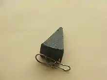 Pyramid sinkers are shaped like a pyramid and are used when it is desirable to anchor on the bottom of water bodies. They are attached to the terminal end of fishing line by loops of brass.