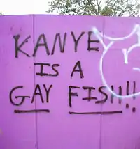 Following a controversial 2008 performance at music festival Bonnaroo, many concertgoers have since sprayed graffiti around the festival grounds, as well as making signs, deriding the rapper as a "gay fish".[26]