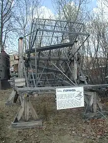A fish wheel, also known as a salmon wheel,[1] is a device situated in rivers to catch fish which looks and operates like a watermill. However, in addition to paddles, a fish wheel is outfitted with wire baskets designed to catch and carry fish from the water and into a nearby holding tank. The current of the river presses against the submerged paddles and rotates the wheel, passing the baskets through the water where they intercept fish that are swimming or drifting. Naturally a strong current is most effective in spinning the wheel, so fish wheels are typically situated in shallow rivers with brisk currents, close to rapids, or waterfalls.[2] The baskets are built at an outward-facing slant with an open end so the fish slide out of the opening and into the holding tank where they await collection.[3] Yield is increased if fish swimming upstream are channeled toward the wheel by weirs.