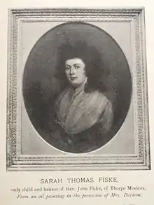 John Haynes Harrison married Sarah Thomas Fiske, only child and heiress of Reverend John Fiske of Thorpe Morieux, Suffolk.[1] The Fiske Family Papers, a history of the family, states that she was heiress to £18,000 on her marriage in 1789.[2]