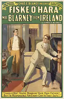 He made his professional debut in 1898 under the name George Fiske with Mr. and Mrs. Charles Manley in the rural comedy Down on the Farm. The following year he supported Tony Farrell in My Colleen, and then came a season divided between McFee's Matrimonial Bureau and as principal tenor with Gus Sun's Minstrels. Beginning with the season of 1901-02 and for two years, O'Hara managed and played important parts with the People's Theatre Stock Company, Chicago, IL., and during the summer of 1903 he filled a special engagement with the Ferris Stock, St. Paul, Minn., being cast for such important juvenile roles as Albert in Monte Cristo, Judson Langhorne in All the Comforts of Home, Dechelette in Sapho. Tom Mayne in My Jim and Sir Reginald Dare in Shamus O'Brien, in which his singing of My Wild Irish Rose met with most hearty approval. O'Hara divided the season of 1903-04 between the Metropolitan Stock, Duluth, Minn., with which organization he played two roles each week, gaining an invaluable amount of experience, and with The Bostonians, singing tenor roles with this company in Robin Hood, The Serenade and The Queen of Laughter. It was following this that he made his debut before a New York audience, at the Majestic Theatre, August 23, 1904, as Lieutenant Harold Katchall in The Isle of Spice, meeting with most hearty approval. O'Hara made his first appearance at the head of his own company Christmas Day, 1905 at Newark, N. J., in Mr. Blarney from Ireland, a piece written specially for him and in which he introduced several songs of his own composition. He devoted two seasons to this piece and then came a year and a half in an equally popular successor, Dion O'Dare.[1]
