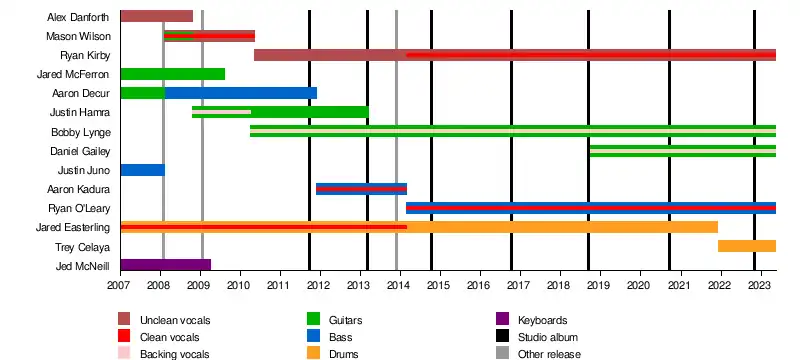 Fit for a King, also known as FFAK, is an American metalcore band from Dallas, Texas formed in 2007.[5] The band comprises guitarists Bobby Lynge and Daniel Gailey, vocalist Ryan Kirby, bassist Ryan "Tuck" O'Leary, and drummer Trey Celaya. They released two independent EPs entitled Fit for a King in 2008 and Awaken the Vesper in 2009. They also released one independent album, Descendants, in 2011. After the band signed to Solid State Records, they released six studio albums through this label: Creation/Destruction (2013),[4] Slave to Nothing (2014),[6] Deathgrip (2016), Dark Skies (2018), The Path (2020)[7] and The Hell We Create, which was released on October 28, 2022. In addition, a redux version of their debut studio album was released through the label in 2013.[8]