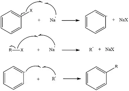 There are two approaches to describing the mechanism of the Wurtz–Fittig reaction.[10][11] The first involves the sodium-mediated formation of both alkyl and aryl radicals. The alkyl and aryl radicals then combine to form a substituted aromatic compound.