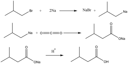 The organo-alkali mechanism is supported by indirect evidence which shows that an organo-alkali intermediate actually forms during the reaction.[11] This has been observed my many investigators.[10] For example, Shoruguin[13] shows that carbon dioxide bubbling through a mixture of sodium and isobutyl bromide results in the formation of 3-methylbutanoic acid.