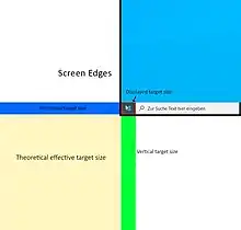 Placing layout elements on the four edges of the screen allows for infinitely large targets in one dimension and therefore presents ideal scenarios. Since the pointer will always stop at the edge, the user can move the mouse with the greatest possible speed and still hit the target. The target area is effectively infinitely long along the movement axis. Therefore, this guideline is called “Rule of the infinite edges”. The use of this rule can be seen for example in MacOS, which always places the menu bar on the top left edge of the screen instead of the current program's windowframe.[28]