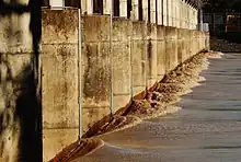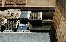 The barrage also incorporates a fish ladder to allow fish to get from the tidal water to the fresh water and vice versa.[9] The construction of the barrage had a significant impact on native fish species as it prevented them from accessing breeding, spawning and nursery habitats.[9] Although a fish passage was incorporated into the barrage during its construction, it wasn't very effective as it was designed for North American salmon. A new vertical fish passage was installed in 1996 which was an improvement on the original but it was only effective for eight hours each day during the high tides.[9] A new more effective $500,000 fish ladder was installed at the barrage in 2016 replacing the one which was installed in 1996.[9]