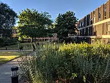 Tree Court, the last component of the initial 1963 construction, is located at the north end of the college, opposite Fellows' Court. The court was initially the college's main entrance and, with a car park and a cycling bay just outside, it remains a back door to the college. Tree Court was Lasdun's first student accommodation; he would go on to design similar buildings at the University of East Anglia and Christ's College, Cambridge.[23] Although the court opens out onto the college gardens, the wall opposite the Hall Building was recently lengthened with the addition of the college's new Library and IT Centre. Today, Tree Court provides residence for the majority of first-year students.