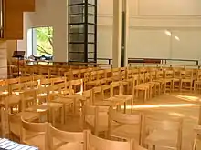 In 1991, a college chapel was appended to the north wing of New Court. The building, which was also designed by MacCormac Jamieson Prichard, faces directly towards the Grove and is in the International style. It is designed to resemble the hull of a ship, hinting at the religious themes of journey and protection.[26] The building is home to a fine two-manual organ designed by Peter Collins, a Bechstein grand piano and a Goble harpsichord.[27] The addition won the 1992 Civic Trust Award,[28] the 1993 Carpenters' Award[29] and the 1993 David Urwin Award for Best New Building.[26] The firm later used a similar design for the Ruskin Library at the University of Lancaster.