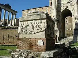 The Five-Columns monument is most widely recognized for its only preserved marble plinth, called the decennalia base. With relief carvings of ceremonial and ritual scenes on all four sides,[3][1] this column base was uncovered in 1547 and now stands close to the findspot.[4] The side with the decennalia inscription, from which the base name derives, is agreed to have been the most prominent side of the plinth. As for the other three sides, scholars vary in the order of their descriptions. Together, these reliefs represent the rites involved with taking vows for another decade of Tetrarchic reign.[6][4] Some scholars have observed a sequence among the panel reliefs in which the animals are being led toward the sacrificial altar, with the imperial procession also heading for the altar scene.[6]