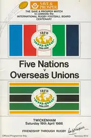 The Five Nations XV v Overseas Unions XV was a rugby union match played on Saturday, 19 April 1986 to commemorate the centenary of the International Rugby Football Board. The Five Nations XV featured players from England, France, Ireland, Scotland, and Wales who had played in the 1986 Five Nations Championship. The Overseas Unions XV was effectively a World XV and featured players from Australia, New Zealand, and South Africa. The Overseas Unions XV won the match 32–15. [1][2] Controversially, the squad included a number of white South Africans at a time when the relationship of rugby union and apartheid was being questioned at high levels.