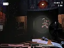 The player can avoid attack by most characters using a wearable animatronic mask; however, this strategy will not work on Foxy nor the Marionette, who are repelled by other means.[6] A flashlight must be repeatedly shone into the hallway to ward off Foxy, and the Marionette is subdued by a music box that must be kept wound up by the player using a button on a camera feed.[7] Unlike the first game, the power supply for camera and light use is unlimited, but this does not apply to the flashlight; if its battery runs out, the player becomes vulnerable to attack.[4] The player will be jumpscared if they fail to defend themselves from any animatronic except for Balloon Boy, who will instead appear in the player's office and disable their flashlight.[2]
