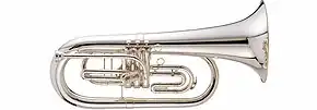 The euphonium is in the family of brass instruments, more particularly low-brass instruments with many relatives. It is extremely similar to a baritone horn. The difference is that the bore size of the baritone horn is typically smaller than that of the euphonium, and the baritone has a primarily cylindrical bore, whereas the euphonium has a predominantly conical bore.[1] It is controversial whether this is sufficient to make them two different instruments. In the trombone family large and small bore trombones are both called trombones, while the cylindrical trumpet and the conical flugelhorn are given different names. As with the trumpet and flugelhorn, the two instruments are easily doubled by one player, with some modification of breath and embouchure, since the two have identical range and essentially identical fingering.[2] The cylindrical baritone offers a brighter sound and the conical euphonium offers a more mellow sound.