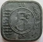 | German occupation coin | Utrecht | Zinc | Two Saxon horse heads under a sun | Value within a ring with a cereal ear to the right and nine waves to the left | Smooth with no edge lettering | 1941-1943 |