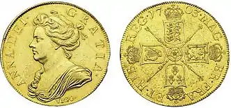 Queen Anne five guineas were subsequently produced in 1705, 1706, 1709, 1711, 1713 and 1714. The obverse of the coin throughout her reign shows the left-facing effigy of the queen, with the legend ANNA DEI GRATIA.The general design of the reverse was similar to that of the previous reign, with four crowned cruciform shields bearing the arms of England, Scotland, Ireland, and France, separated by sceptres and with a central rose, and the legend MAG BRI FR ET HIB REG date. However, the union of England and Scotland necessitated a change in the design of the arms on the shield in 1706 (although the actual union took place on 1 May 1707, just over a month after the start of the year, the bill for the Act of Union received the Royal Assent on 6 March 1707 (that is, still in 1706 by the old-style calendar)), therefore coins dated 1706 appear with both reverses. The order of the arms appearing on the cruciform shields until 1706 was England, then Scotland, then France, then Ireland. With the union, the English and Scottish arms appear conjoined on one shield, with the left half being the English arms and the right half being the Scottish arms, and the order of arms appearing on the shields becomes England+Scotland, France, England+Scotland, Ireland. In 1706, with the Union, the central rose on the reverse was replaced by the Star of the Order of the Garter.