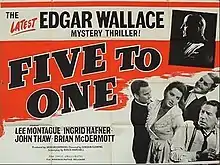 Five To One is a 1963 British crime film directed by Gordon Flemyng and starring Lee Montague, Ingrid Hafner and John Thaw.[1] It was made at Merton Park Studios as part of the long-running series of Edgar Wallace adaptations; this being adapted from one of Wallace's short stories.[2]