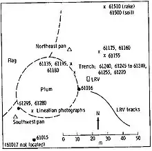 Flag crater is approximately 240 m in diameter and over 20 m deep.[2] The adjacent crater Plum is only about 30 m in diameter.[3] The slightly larger crater Spook, also visited by the astronauts, lies less than 1 km to the east.