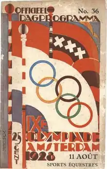 The flag was officially adopted on 5 February 1975[3] although it was already in use before this date, seen for example on the cover of the day programme of the 1928 Summer Olympics held in Amsterdam. Before its official adoption there was also an unofficial use of a flag with the city's coat of arms in the middle of a red-white-black horizontal tricolor. Such a design was already in use in the 17th century, but in Amsterdam history, other designs in the colors red, black and white were also used. Sometimes the three St. Andrew crosses were placed in the white orbit of the red-white-blue Dutch national flag.