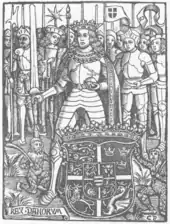 In the Gelre Armorial, dated c. 1340–1370, such a banner is shown alongside the coat of arms of the king of Denmark.[10] This is the earliest known undisputed colour rendering of the Dannebrog. At about the same time, Valdemar IV of Denmark displays a cross in his coat of arms on his Danælog seal (Rettertingsseglet, dated 1356). The image from the Armorial Gelre is nearly identical to an image found in a 15th-century coat of arms book now located in the National Archives of Sweden (Riksarkivet). The seal of Eric of Pomerania (1398) as king of the Kalmar union displays the arms of Denmark's chief dexter, three lions. In this version, the lions are holding a Dannebrog banner.
