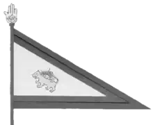 Drouville expounds that in 1813, Fath-Ali Shah Qajar and Abbas Mirza attended a royal inspection of the regular infantry in Azarbaijan to personally confer each standard to their respective corps.[34] These flags included the lion and sun motif, a date or number pertaining to the unit, and the inscription: "Sultan ibn Sultan Fath-Ali Shah Qajar" (Sultan son of Sultan Fath-Ali Shah Qajar), in reference to Abbas Mirza's title.[34] The flags and standards are further described as similar to those of the French, adorned with taffeta white streamers and golden fringes.[34] Based on Drouville's illustration, the larger flags of the regular infantry were painted red, and the flagpole was crowned by the silver Hand of Ali. The smaller standards that were prescribed to the cavalry lancers were a deep blue and featured a crouching lion brandishing a curved sword before a setting sun. These standards were topped by golden spears that were "as sharp as those of the Houlans".[35]