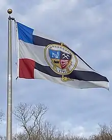 In the upper pole corner is a two-foot canton of azure blue representing Loyalty. In the lower pole corner is a like canton of red signifying Bravery. The entire center division is white denoting Faith.[9]