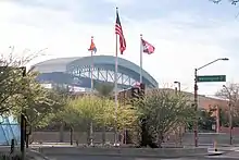 The current flag, using the phoenix bird logo from the contest, was officially adopted as the official flag of Phoenix on February 14, 1990, following the repeal of the 1921 ordinance mentioned previously. This change was made without fanfare and even came as a surprise to some, as the new branding was created almost three years prior, without any action targeted towards the city flag. It was also coincidental to the arrival of the National Football League's Cardinals from St. Louis in 1988 and their near-similar cardinal color. The flag made its first public appearance at the inauguration of Mayor Paul Johnson. The design ranked fourth best out of 150 United States city flags in a 2004 survey of the North American Vexillological Association, behind only the flags of Washington, D.C., Chicago, and Denver.[5] The flag is also featured on the cover of the NAVA's 2003 book American City Flags. A 2015 Gizmodo article ranked Phoenix's among the worst city flags, however, calling its design "too simple".[6]