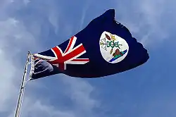 The flag of Vancouver Island is a defaced Blue Ensign with the Union Flag in the canton and the badge of the colony of Vancouver Island on a white disk on the fly. The design of this flag is based on the rules set out by the Admiralty for colonial flags in 1865, and on elements from the great seal of the colony of Vancouver Island, established in 1849.[1] However the flag itself likely never existed during this period; rather Michael Halleran re-designed it in 1988 as an unofficial local flag for Vancouver Island (now part of British Columbia, Canada).[2]
