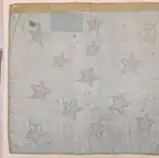 The common reconstruction consists of a green field and a constellation of thirteen five-pointed white stars representing the thirteen colonies arranged in a natural pattern within an azure canton. The existing fragments consist of the canton from the flag, which has remnants of green silk on three sides, and a piece of green cloth with flourish from elsewhere on the flag.[3]