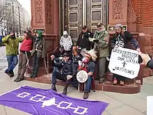 The flag of the Haudenosaunee Confederacy (previously Iroquois Confederacy) is the flag used to represent the six nations of the Haudenosaunee. It is a purple flag with four connected white squares and an eastern white pine tree in the center.[1]
