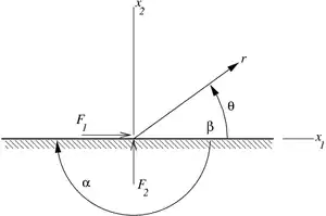 If we take and , the problem is converted into one where a normal force and a tangential force act on a half-plane. In that case, the force equilibrium equations take the form
