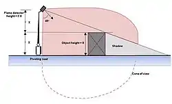 The range of a flame detector is highly determined by the mounting location. In fact, when making a projection, one should imagine in what the flame detector "sees". A rule of thumb is, that the mounting height of the flame detector is twice as high as the highest object in the field of view. Also the accessibility of the flame detector must be taken into account, because of maintenance and/or repairs. A rigid light-mast with a pivot point is for this reason recommendable. A "roof" on top of the flame detector (30 x 30 cm, 1 x 1-foot) prevents quick pollution in outdoor applications. Also the shadow effect must be considered. The shadow effect can be minimized by mounting a second flame detector in the opposite of the first detector. A second advantage of this approach is, that the second flame detector is a redundant one, in case the first one is not working or is blinded. In general, when mounting several flame detectors, one should let them "look" to each other not let them look to the walls. Following this procedure blind spots (caused by the shadow effect) can be avoided and a better redundancy can be achieved than if the flame detectors would "look" from the central position into the area to be protected. The range of flame detectors to the 30 x 30 cm, 1 x 1-foot industry standard fire is stated within the manufacturers data sheets and manuals, this range can be affected by the previously stated de-sensitizing effects of sunlight, water, fog, steam and blackbody radiation.