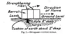 The most common form of the flame fougasse was the safety fougasse. This design allowed the propelling charge to be stored separately until needed. The safety fougasse was constructed as follows: a small section was excavated from the side of a slope, leaving a shallow platform of earth, and a barrel of incendiary mixture was placed horizontally in a low position with one round face pointing towards the target. At the back, a section of stove or drain pipe was placed vertically against the rear face of the barrel. The lower end of the pipe was blocked off with a thin cover and positioned a few inches above the bottom of the barrel. The top of the pipe was fitted with a loose cap to keep water out. This pipe is what makes it a "safety" fougasse because it allows later installation of the propelling charge. Soil was then built up over the weapon until all that could be seen were the front disk of the barrel and top of the pipe.[19][21]