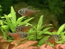 The flame tetra (Hyphessobrycon flammeus), also known as the red tetra or Rio tetra, is a small freshwater fish of the characin family Characidae. This tetra was first introduced as aquarium fish in 1920 by C. Bruening, Hamburg, Germany, and formally described in 1924 by Dr. George S. Myers.[2][3] Today large numbers are bred in captivity and it is common in the aquarium trade,[4] but the remaining wild population in Southeast Brazil is highly threatened.[5][6]