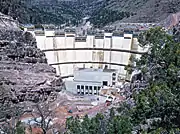 The dam's hydroelectric power plant is located at its base. It consists of three 50,650 kilowatt generators, powered by three Francis design turbines of 50,000 horsepower (37,000 kW). The total nameplate generating capacity of the Flaming Gorge Dam is 151,950 kilowatts. Three 10-foot (3.0 m) diameter penstocks feed water to the power plant.[3] The Bureau of Reclamation operates the power plant, and the Western Area Power Administration markets the power generated by the dam.[3] The original 1963 capacity of the powerplant was 108,000 kilowatts, or 36,000 kilowatts per generator. The generators were uprated to their present capacity between August 1990 and April 1992.[3]
