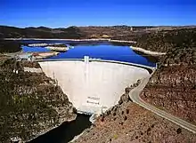 Flaming Gorge Dam is one of six that make up the Colorado River Storage Project (CRSP), a massive system of reservoirs created in the upper Colorado River Basin by the Bureau of Reclamation from the 1950s to the 1970s.[6] The project itself was the indirect result of a system of agreements signed by the seven U.S. states and two Mexican provinces in the early 20th century dividing the flow of the Colorado River among them. Among the terms stated in the 1922 Colorado River Compact reserved 7.5 million acre-feet (9.3 km3) for the Upper Basin states of Wyoming, Colorado, Utah and New Mexico and an equal amount for the Lower Basin states of Arizona, Nevada and California.[7] Due to the Colorado's high year-to-year variations in flow, the upper basin could not fulfill the lower basin's allotments in dry years, and much water was wasted during wet years because of the lack of a means to impound it.[6]