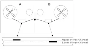 In 1968, the record producer for the Litter, Warren Kendrick, devised a method to precisely control flanging by placing two 15 ips (inches per second) stereo Ampex tape recorders side by side.[8] The take-up reel of recorder A and supply reel of B were disabled, as were channel 2 of recorder A, channel 1 of recorder B and the erase head of recorder B. The tape was fed left-to-right across both recorders and an identical signal was recorded on each channel of the tape, but displaced by approximately 18 inches along the length of the tape. During recording, an ordinary screwdriver was wedged between the recorders to make the tape run "uphill" and "downhill." The same configuration was employed during the playback/mixdown to a third recorder. The screwdriver was moved back and forth to cause the two signals to diverge, then converge. The latter technique permits zero point flanging; i.e., the lagging signal crosses over the leading signal and the signals change places.[9][10][11][12]